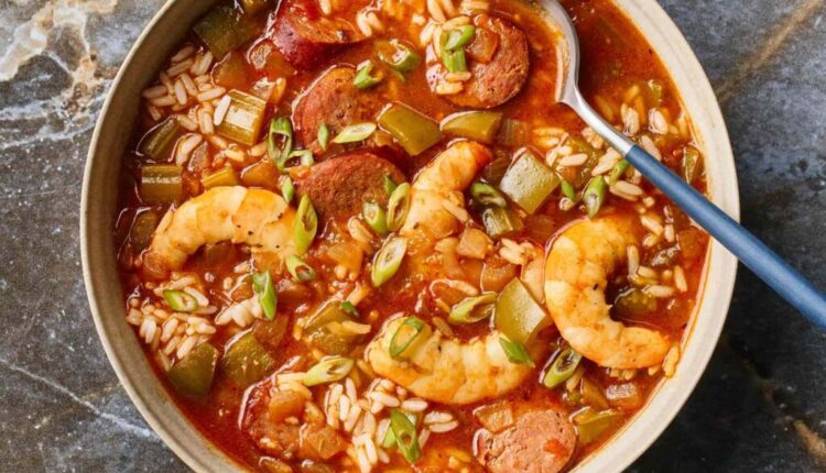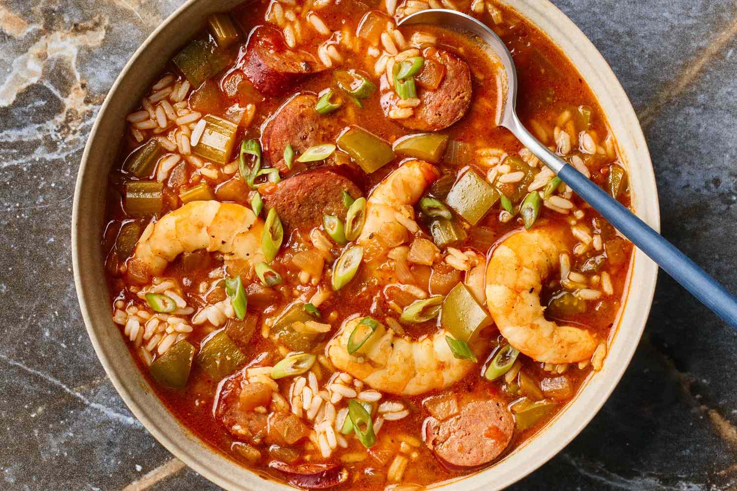 जांबलया सूप लुईझियानाच्या क्लासिक जांबालयाचे हृदय घेते आणि ते ठळक, अनुभवी मटनाचा रस्सा असलेल्या समाधानकारक वाडग्यात बदलते; मोकळा कोळंबी मासा; स्मोकी सॉसेज; आणि कोमल तांदूळ. कांदे, भोपळी मिरची आणि सेलेरीच्या दक्षिणेकडील प्रिय “पवित्र ट्रिनिटी” वर रेखाटून, हे सूप तुम्ही अँड्युइल किंवा स्मोक्ड सॉसेज तपकिरी कराल तेव्हापासून चव वाढवते, भाज्या शिजवण्यासाठी आणि बेस खोल करण्यासाठी त्याची चरबी प्रदान करते. ठेचलेले टोमॅटो, क्रेओल सिझनिंग आणि थाईम मिसळल्याने प्रत्येक चमच्याला जांबलय-प्रेरित चव येते, तर उकळलेले तांदूळ सूपला एक आनंददायी घनता देते जे जडपणाशिवाय मनापासून वाटते.