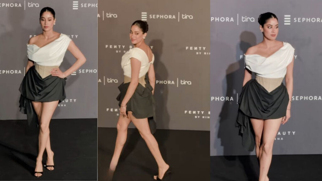 या विशेष कार्यक्रमासाठी, जान्हवीने डिझायनर रिया कोस्टा यांचा काळा आणि पांढरा ड्रेस निवडला, जो तिने पॅरिस टेक्सासमधील महागड्या लिडिया मुल हील्ससह स्टाइल केला होता. स्लीक अंबाडा, न्यूड ग्लोइंग मेकअप आणि किमान ॲक्सेसरीजने तिच्या संपूर्ण लुकला अतिशय क्लासी आणि हाय-फॅशन टच दिला.