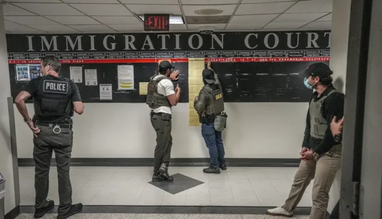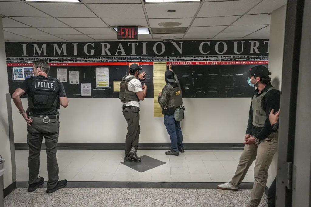 न्यू यॉर्क शहरातील इमिग्रेशन न्यायालये आणि फेडरल सुविधा हे व्यापक चर्चेचे केंद्रबिंदू राहिले आहेत. च्या प्रतिमा इमिग्रेशन आणि सीमाशुल्क अंमलबजावणी मॅनहॅटन इमिग्रेशन कोर्टातील एजंट प्रशासनाच्या आक्रमक अंमलबजावणीच्या पवित्र्याचे प्रतीक बनले आहेत, ज्याचा राज्य अधिकाऱ्यांचा तर्क आहे की स्थलांतरित समुदायांमध्ये भीती निर्माण झाली आहे.