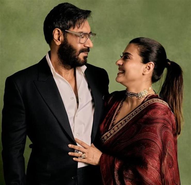 चित्रात सुंदर जोडपे एका निःशब्द हिरव्या पार्श्वभूमीवर एकत्र पोज देत आहे. अजय देवगण पांढरा शर्ट आणि चष्मा असलेल्या गडद गडद काळ्या सूटमध्ये परिधान केलेला दिसतो आणि त्याची सही दाढी ठेवतो. दुसरीकडे, काजोल, क्लिष्ट तपशीलांसह, स्लीक पोनीटेल आणि स्टेटमेंट चोकर नेकलेससह स्टाइल केलेल्या मरुन साडीमध्ये आश्चर्यकारक दिसते. दोघे एकमेकांकडे प्रेमळ स्मित आणि प्रेमाने पाहतात.
