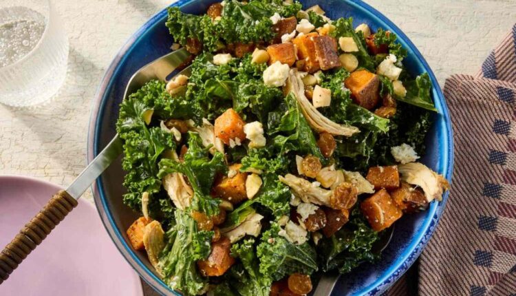 या काळे आणि रताळ्याची कोशिंबीर चिकनसोबत थंड हवामानातील सर्वोत्तम सॅलड आहे. काळे आणि रताळे हे व्हिटॅमिन ए आणि सी समृध्द असतात – सर्दी आणि फ्लूच्या हंगामात तुमच्या रोगप्रतिकारक शक्तीला समर्थन देण्यासाठी उत्तम. शिवाय, चिकनमधील प्रथिनांसह त्यांचे फायबर, तुम्हाला पूर्ण आणि समाधानी वाटण्यास मदत करेल. गोड बटाटे एक भाजलेले कॅरॅमलायझेशन विकसित करतात, ज्यामुळे त्यांचा नैसर्गिक गोडवा येतो, तर काळे गोड, तिखट, मातीच्या ड्रेसिंगने मसाज केल्याने कोमल आणि कुरकुरीत बनते. ब्राई फेटा गोडपणात संतुलन आणतो, तर कुरकुरीत बदाम चघळलेल्या मनुका पूरक असतात. या सॅलडसाठी कोणत्या प्रकारचे काळे चांगले काम करतात यासह आमच्या तज्ञांच्या टिप्स वाचत रहा.