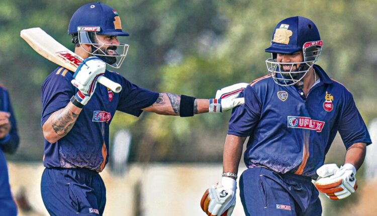 दिल्लीचा कर्णधार ऋषभ पंत, शुक्रवारी बेंगळुरूमधील BCCI सेंटर ऑफ एक्सलन्स ग्राउंडवर, गुजरात आणि दिल्ली यांच्यातील विजय हजारे ट्रॉफी 2025-26 क्रिकेट सामन्यादरम्यान सहकारी विराट कोहलीसोबत. फोटो