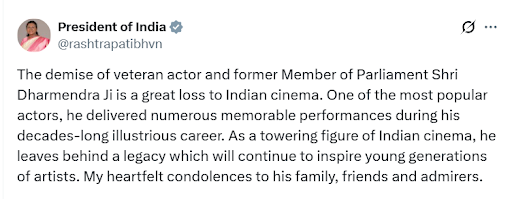 राष्ट्रपती द्रौपदी मुर्मू यांनी सोशल मीडियावर धर्मेंद्र यांना श्रद्धांजली वाहिली आहे.