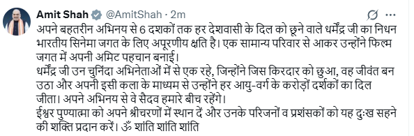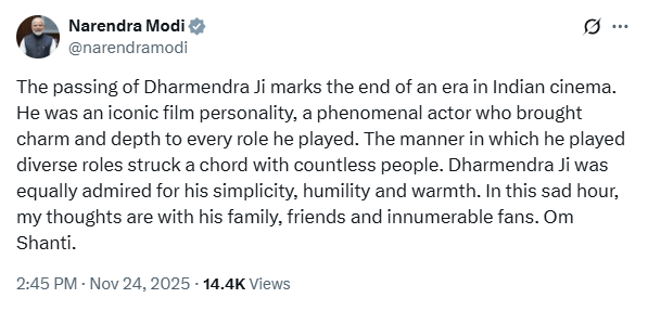 धर्मेंद्रजींच्या निधनाने भारतीय चित्रपटसृष्टीतील एका युगाचा अंत झाला. ते एक प्रतिष्ठित चित्रपट व्यक्तिमत्व होते, एक अद्भुत अभिनेता होता ज्याने प्रत्येक पात्रात खोली आणि आकर्षण आणले. वेगवेगळ्या भूमिका साकारण्याची त्यांची शैली असंख्य लोकांच्या हृदयाला भिडली. धर्मेंद्र जी यांच्या साधेपणा, नम्रता आणि प्रेमळपणाचे तितकेच कौतुक केले गेले. या दु:खाच्या वेळी त्यांचे कुटुंबीय, मित्र आणि असंख्य चाहत्यांप्रती माझ्या संवेदना. ओम शांती.