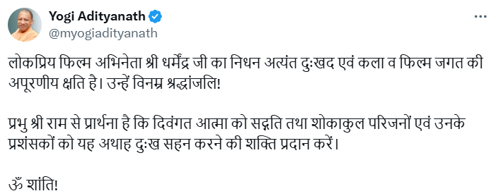 उत्तर प्रदेशचे मुख्यमंत्री योगी आदित्यनाथ यांनीही धर्मेंद्र यांना श्रद्धांजली वाहिली आहे.