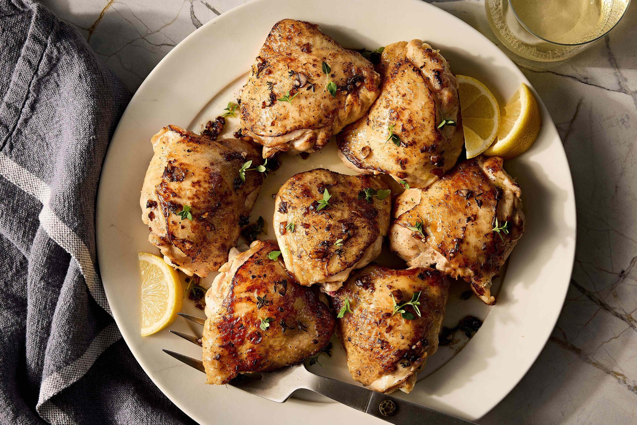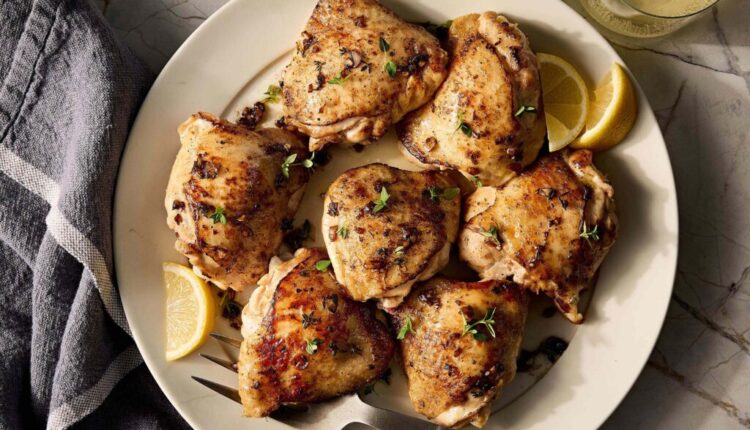 लिंबाचा तेजस्वी ताजेपणा आणि थाईमचा मातीचा सुगंध आणि रसाळ चिकन मांड्या एकत्र करून ही डिश साधी पण मोहक आहे. हे आठवड्याच्या रात्रीच्या जेवणासाठी किंवा कॅज्युअल मेळाव्यासाठी योग्य आहे.