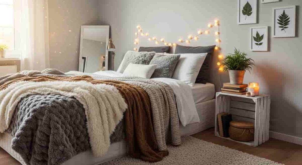 - पलंगावर: तुमच्या शीटच्या वर जाड कंफर्टर किंवा रजाई ठेवा. त्यावर एक मऊ लोकर ब्लँकेट किंवा शाल घाला. वेगवेगळ्या रंगांच्या २-३ गाद्या ठेवा.