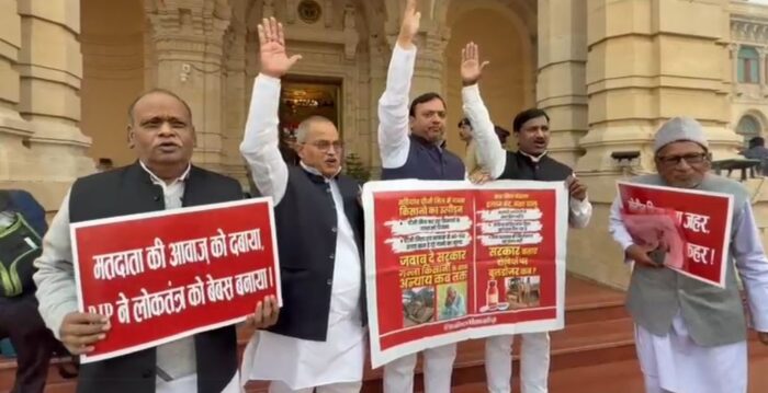 सपा आमदारांनी विधानसभेबाहेर जमून सरकारविरोधात घोषणाबाजी केली. त्यांनी आपल्या मागणीबाबत विधानसभेच्या आत आणि बाहेर निदर्शने केल्याने सभागृहाचे कामकाजही विस्कळीत झाले.