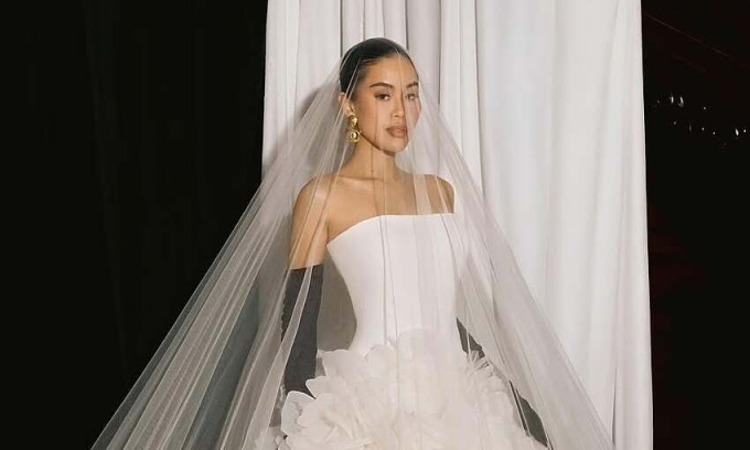 तिच्या मंगेतराचा हात धरून, न्गुयेन स्ट्रॅपलेस गाऊन परिधान करते ज्यामध्ये तिची टॅन केलेली त्वचा आणि लांब पाय हायलाइट होते. चोळीवर मोत्याच्या उच्चारांनी सुशोभित केलेले ब्रोकेड डिझाइन, Pallas Couture Privée या जागतिक स्तरावर प्रसिद्ध लक्झरी ब्राइडल लेबलचे आहे.