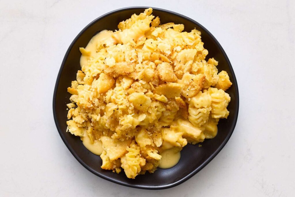 - ही रेसिपी आठ 1-कप रॅमेकिन्समध्ये बनवण्यासाठी, चुरा अर्धवट करा आणि मॅक आणि चीज 375°F वर 8 ते 10 मिनिटे बेक करा.