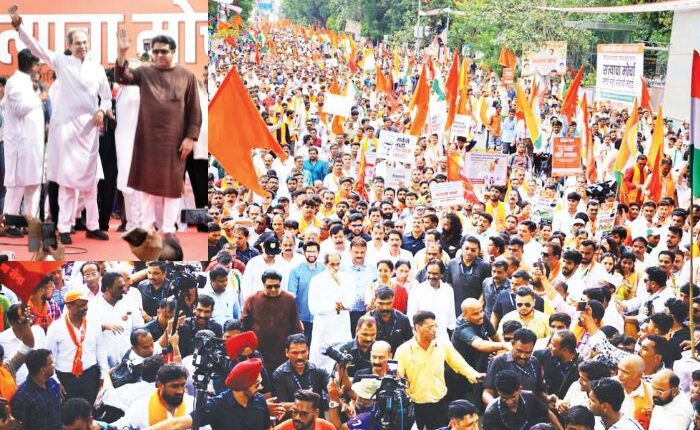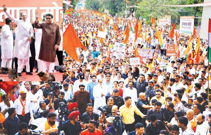दूरदूरहून कार्यकर्ते मोर्चात सहभागी होण्यासाठी जथेच्या जथे दक्षिण मुंबईत धडकले होते. छत्रपती शिवाजी महाराज टर्मिनस, चर्चगेट, मरीन लाईन्स या स्थानकांमध्ये जोरदार घोषणाबाजी करून आसमंत दणाणून सोडला. ‘मतचोरांचं करायचं काय, खाली डोकं वर पाय…’, ‘मत चोरणाऱ्या कमळाबाईचा निषेध असो’, ‘करावा लागेल करावा लागेल अॅनाकोंडाचा खात्मा करावा लागेल’, ‘उघडा डोळे बघा नीट, मतदार याद्या आहेत का नीट…’, ‘शिवसेना झिंदाबाद’, ‘मनसेना झिंदाबाद…’ अशा घोषणा देत कार्यकर्ते मोर्चाच्या ठिकाणी कूच करताना दिसत होते. फॅशन स्ट्रीट ते मेट्रो सिनेमापर्यंतचा मार्ग मोर्चेकऱ्यांच्या गर्दीने फुलून गेला होता.