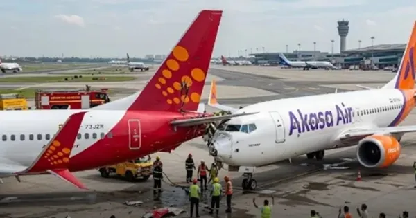 नवी दिल्ली. गुरुवारी दिल्लीच्या इंदिरा गांधी आंतरराष्ट्रीय विमानतळावर ग्राउंड हँडलिंगच्या एका घटनेत दोन विमानांची टक्कर झाली. स्पाइसजेटच्या बोईंग ७३७ विमानाने टॅक्सी चालवताना पार्क केलेल्या अकासा एअरच्या विमानाला स्पर्श केला. यामुळे स्पाईसजेट विमानाच्या उजव्या विंगलेटचे नुकसान झाले, तर आकासा एअरच्या विमानाच्या डाव्या आडव्या स्टॅबिलायझरलाही हानी पोहोचली.