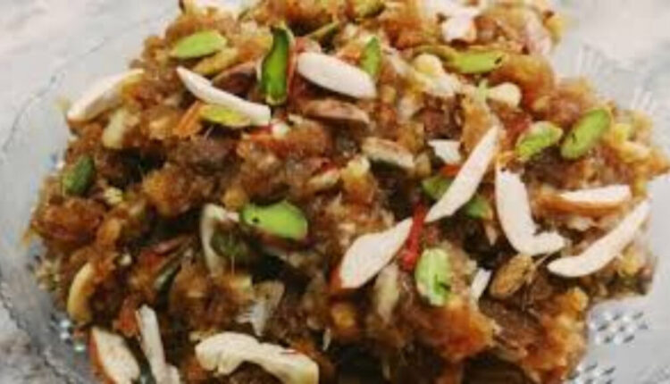 या मिश्रणात तयार केलेला गुळ-साखर सरबत घाला आणि मंद आचेवर २ मिनिटे शिजवा. जर हलवा चिकट वाटत असेल तर तुम्ही १ चमचे तूप घालू शकता. शेवटी वेलची पावडर आणि पिस्त्याने सजवा.