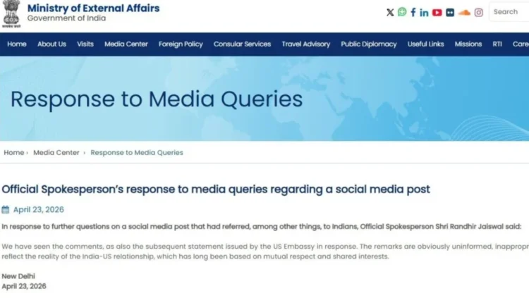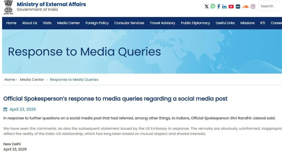 भारतीयांना लक्ष्य करणाऱ्या सोशल मीडियावर प्रसारित केलेल्या आक्षेपार्ह टिप्पण्यांना भारताने औपचारिकपणे फटकारले आहे, असे म्हटले आहे की या टिप्पण्या “स्पष्टपणे माहिती नसलेल्या, अयोग्य आणि खराब चवीच्या आहेत” आणि भारत-अमेरिका संबंधांचे वास्तव प्रतिबिंबित करत नाहीत. 23 एप्रिल 2026 रोजी नवी दिल्ली येथे एका साप्ताहिक मीडिया ब्रीफिंगमध्ये, अधिकृत प्रवक्ते श्री रणधीर जैस्वाल यांना एका सोशल मीडिया पोस्टबद्दल विचारण्यात आले ज्यामध्ये इतर गोष्टींबरोबरच भारतीयांचा अपमानास्पद शब्दात उल्लेख केला होता. पुढील प्रश्नांना उत्तर देताना ते म्हणाले: “आम्ही टिप्पण्या पाहिल्या आहेत, तसेच यूएस दूतावासाने उत्तरात जारी केलेले विधान देखील पाहिले आहे. टिप्पण्या स्पष्टपणे माहिती नसलेल्या, अयोग्य आणि खराब चवीच्या आहेत. ते भारत-अमेरिका संबंधांचे वास्तव प्रतिबिंबित करत नाहीत, जे दीर्घकाळापासून परस्पर आदर आणि सामायिक हितसंबंधांवर आधारित आहेत.”