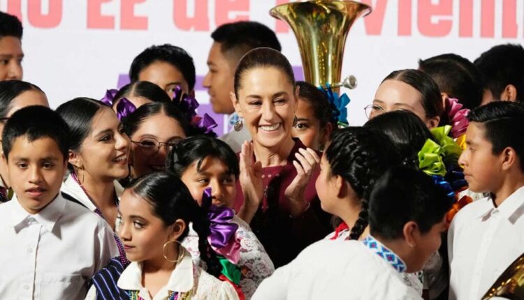 मेक्सिको सिटीमधील नॅशनल पॅलेसमध्ये स्थानिक मुलांचा संगीत बँड मेक्सिकन राष्ट्राध्यक्ष क्लॉडिया शेनबॉमला घेरतो.