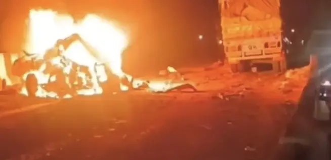 मिर्झापूर: ट्रकचे ब्रेक निकामी झाल्याचा संशय असलेल्या एका बहु-वाहनांचा ढीग, उत्तर प्रदेशातील मिर्झापूर जिल्ह्यात एक ज्वलंत साखळी प्रतिक्रिया भडकण्यापूर्वी दोन अवजड वाहनांमध्ये प्रवासी कार अडकून चिरडली गेली.