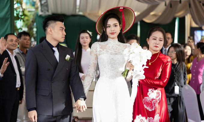 मिस व्हिएतनाम 2020 दो थी हा (आर) आणि तिचा पती, उद्योगपती गुयेन व्हिएत वुओंग, 22 ऑक्टोबर 2025 रोजी त्यांच्या वधूच्या मिरवणुकीत. फोटो सौजन्याने हा |