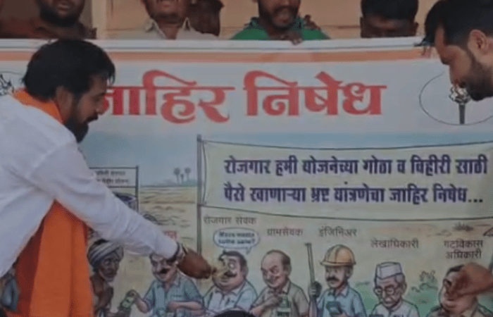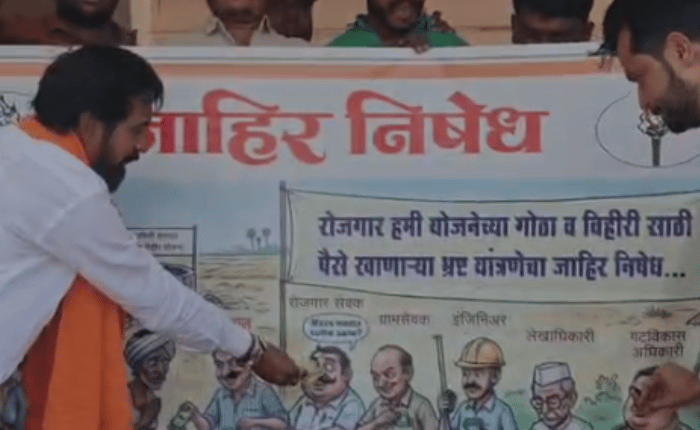 हिंगोली जिल्ह्यातील सेनगाव तालुक्यातील धनगरवाडी येथे रोजगार हमी योजनेअंतर्गत (रोहयो) मोठ्या प्रमाणात भ्रष्टाचार झाला आहे. शेतकऱ्यांना न्याय मिळावा, यासाठी सोमवारी शिवसेनेने (उद्धव बाळासाहेब ठाकरे) जिल्हाप्रमुख संदेश देशमुख यांच्या नेतृत्वाखाली अनोखे आंदोलन करण्यात आले. सेनगाव पंचायत समिती कार्यालयासमोर भ्रष्ट यंत्रणेच्या प्रतीकात्मक प्रतिमेला पैसे खाऊ घालून प्रशासनाच्या निषेधार्थ शिवसेनेने आंदोलन केले. तसेच भ्रष्ट अधिकाऱ्यांचं करायचं काय खाली मुंडक वर पाय, अशी घोषणाबाजी करत परिसर दणाणून सोडला.