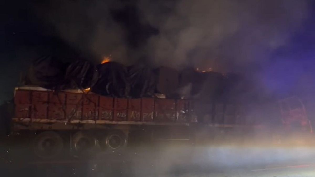 अजमेर रोड हायवेवर भरधाव वेगाने जाणाऱ्या ट्रकला अचानक आग लागल्याने भीतीचे वातावरण निर्माण झाले