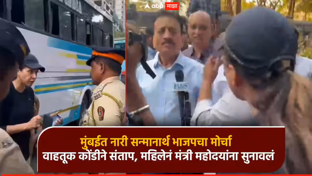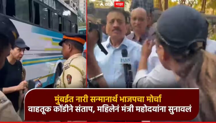 मुंबईत भाजपकडून महिलांच्या सन्मानासाठी काढण्यात आलेल्या मोर्चावेळी वाहतूक कोंडी झाल्याने अनेकजण अडकून पडले होते. वाहतूक कोंडीमुळे उशीर झाला, ताटकळत बसावे लागल्याने एका महिलेकडून थेट मोर्चास्थळी जाऊन गोंधळ घालण्यात आला. विशेष म्हणजे, मंत्री गिरीश महाजन यांना देखील यावेळी ह्या महिलेच्या रोषाचा सामना करावा लागला. महिलेनं मंत्री महोदयांपुढे आपला संताप व्यक्त करत, शेकडो लोक आपल्या मोर्चामुळे वाहतूक कोंडीत अडकून पडल्याचं म्हटलं. विरोध करायचाच तर तो मैदानात करा, वाहतूक कोंडी का करत आहात? असा प्रश्न करत महिलेने महाजन यांना देखील सुनावले. महिलेचा हा व्हिडिओ व्हायरलो होत असून विरोधकांकडूनही शेअर केला जात आहे. दरम्यान, आमदार रोहित पवार यांनी देखील या व्हिडिओचा संदर्भ देत भाजपच्या आंदोलनावर टीका केलीय. दरम्यान, यावेळी महिला आणि पोलिसांमध्ये देखील वाद होताना दिसून आलं.
