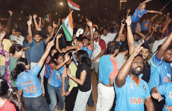 हिंदुस्थानी संघाला जगज्जेते बनविण्यासाठी नरेंद्र मोदी स्टेडियममध्ये देशाच्या कानाकोपऱयातून चाहते दाखल झाले, पण यात सर्वाधिक आकडा मुंबईकरांचा होता. त्यामुळे स्टेडियम ‘भारत माता की जय’बरोबर ‘गणपती बाप्पा मोरया’चाही जयघोष सुरू होता.