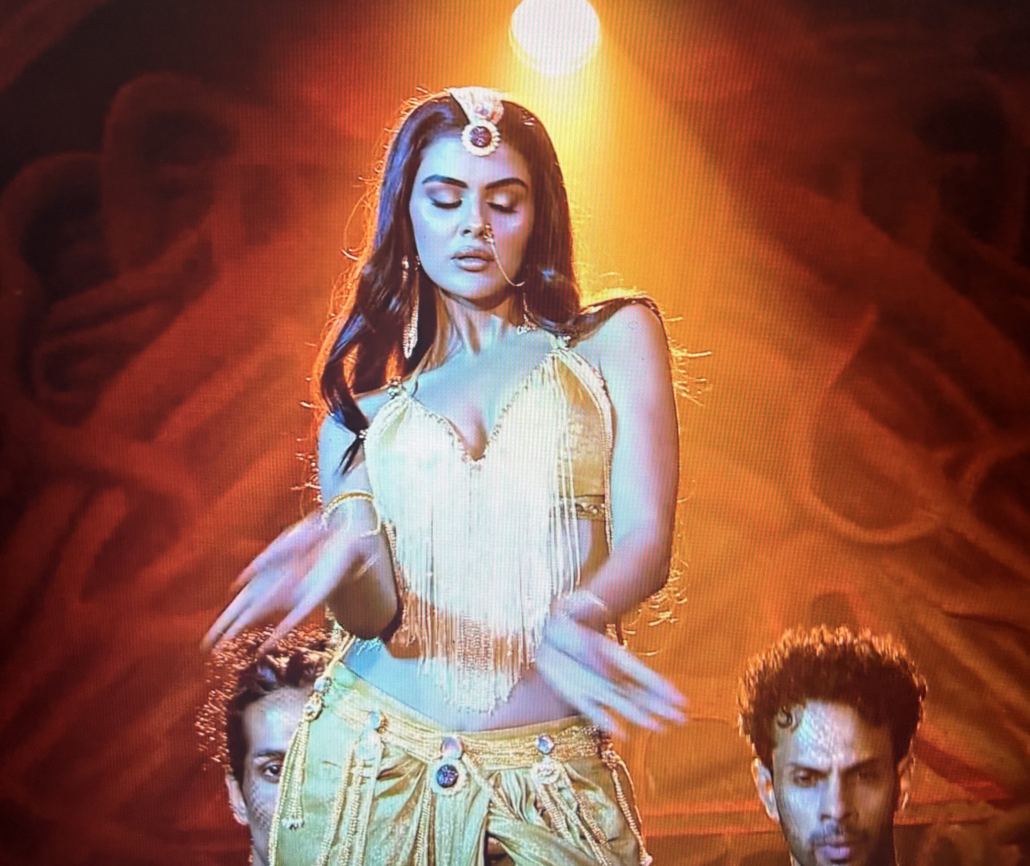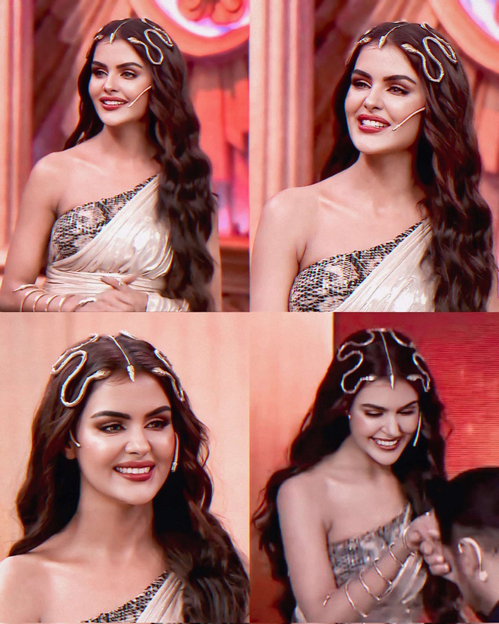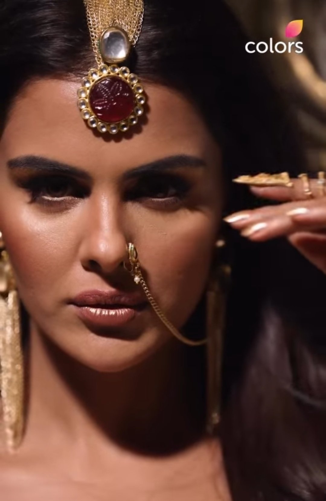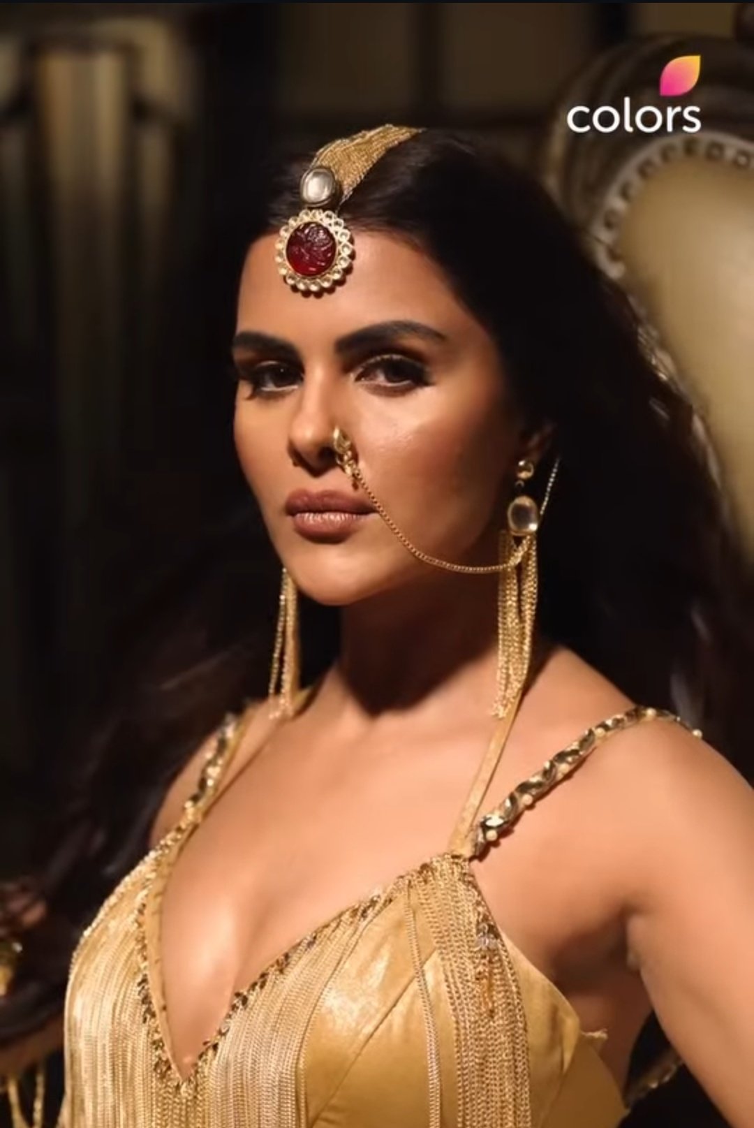 प्रियंका चहर चौधरीच्या पात्रात सोनेरी-थीम असलेली जोडणी आहे, ज्यात एकत्रित तपशीलांसह स्कर्ट आणि एक स्लिट आहे, सोनेरी ब्रॅलेट, फ्रिंज आणि जुळणारे सामान – एक पौराणिक, लोककथा-प्रेरित देखावा जो भूतकाळातील मौनी रॉय, तेजस्ती आणि ज्यास्ती यांच्या नागिनांची आठवण करून देणारा आहे.