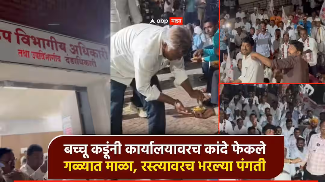 Bacchu kadu: बच्चू कडूंनी सरकारी कार्यालयावर फेकले कांदे; रस्त्यावरच भरवल्या पंगती, अधिकाऱ्यांशी फोनवरुन चर्चा