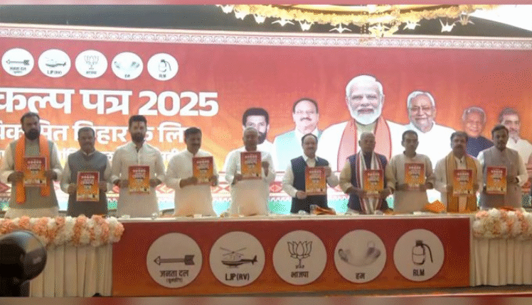 नॅशनल डेमोक्रॅटिक अलायन्स (NDA) ने 2025 च्या बिहार निवडणूक जाहीरनाम्याचे अनावरण केले, संकल्प पत्ररोजगार, पायाभूत सुविधा, शिक्षण आणि समाजकल्याण या सर्व क्षेत्रात परिवर्तनीय विकासाचे वचन देणे.
