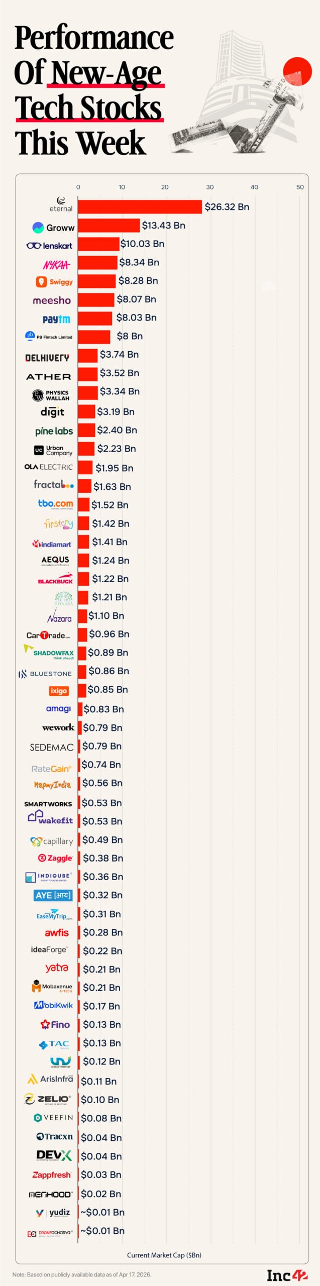 नवीन-युग टेक समभागांनी या आठवड्यात त्यांची रॅली वाढवली कारण व्यापक भारतीय बाजाराने काही पायरी पुन्हा मिळवल्या. Inc42 च्या कव्हरेज अंतर्गत 56 नवीन-युगातील टेक स्टॉक्सपैकी 46 या आठवड्यात 0.06% ते 20% पेक्षा जास्त वाढले.