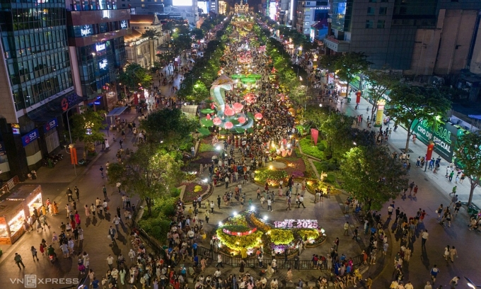 हो ची मिन्ह सिटीच्या डाउनटाउनमधील गुयेन ह्यू फ्लॉवर स्ट्रीटवर जानेवारी 2025 मध्ये पर्यटकांची गर्दी असते. VnExpress/Quynh Tran द्वारे फोटो