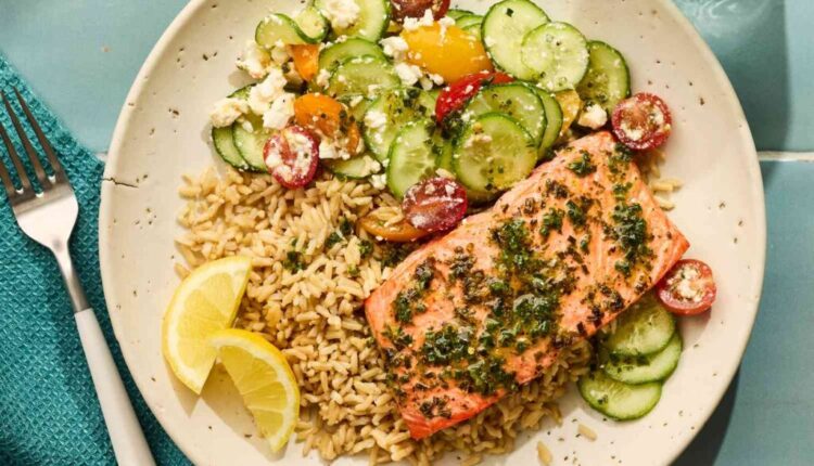 फ्लेकी ब्रोइल्ड सॅल्मनला झिस्टी लिंबू ड्रेसिंगने रिमझिम केले जाते जे संपूर्ण डिश उजळते. हे फ्लफी ब्राऊन राईसच्या बेडवर सर्व्ह केले जाते, जे लिंबूवर्गीय चव शोषून घेते. काकडी, चेरी टोमॅटो आणि फेटा चीज यांचे कुरकुरीत सॅलड क्रीमीपणा आणि ताजेतवाने क्रंच आणते.