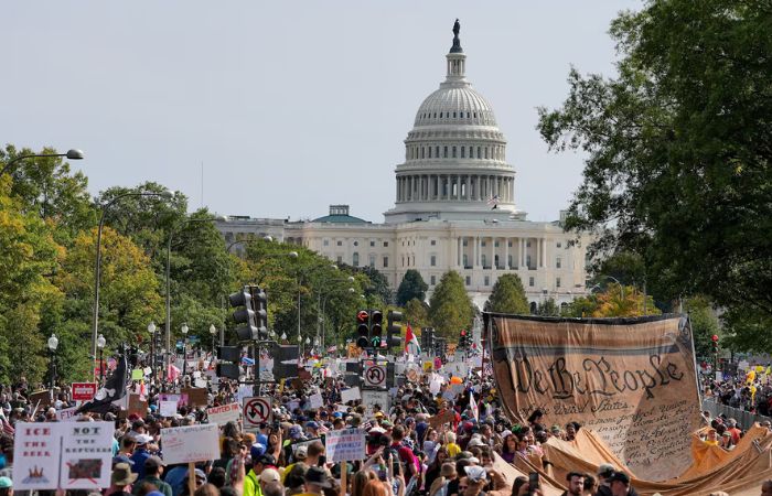 रविवारी अमेरिकेत राष्ट्राध्यक्ष ट्रम्प यांच्या विरोधात सर्वात मोठे निदर्शने झाली. देशभरातील विविध शहरांमध्ये २,६०० हून अधिक रॅली काढण्यात आल्या. या रॅलींमध्ये जवळपास ७० लाख लोक सहभागी झाले होते. या निदर्शनांना ‘नो किंग्ज” असे नाव देण्यात आले आहे.