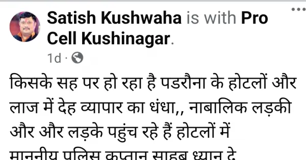 पांढर्या पोज आणि खाकीच्या गणवेशात गडबड करून, पाद्रौना नगर पालिका परिषदचे अध्यक्ष उमेदवार सतीश कुशवाहा यांनी २ September सप्टेंबर २०२25 रोजी त्यांच्या फेसबुक पेज आयडीवरील त्यांच्या फेसबुक पेज आयडीवर समाजासाठी एक गंभीर मुद्दा आहे. त्याने हा प्रश्न पोस्ट केला आणि स्पास्टला विचारले की “सर्व काही, हॉटेल्समध्ये शरीराच्या व्यापाराचा व्यवसाय आहे आणि पॅड्रौना येथे लाजिरवाणे आहे,” अल्पवयीन मुलगी आणि मुले हॉटेलमध्ये आदरणीय पोलिस कॅप्टन सर हॉटेलमध्ये पोहोचत आहेत. लोकांचा असा विश्वास आहे की जर एखादी पाने पोलिसांच्या इच्छेशिवाय हलली नाही तर मग त्यासाठी कोण जबाबदार आहे?