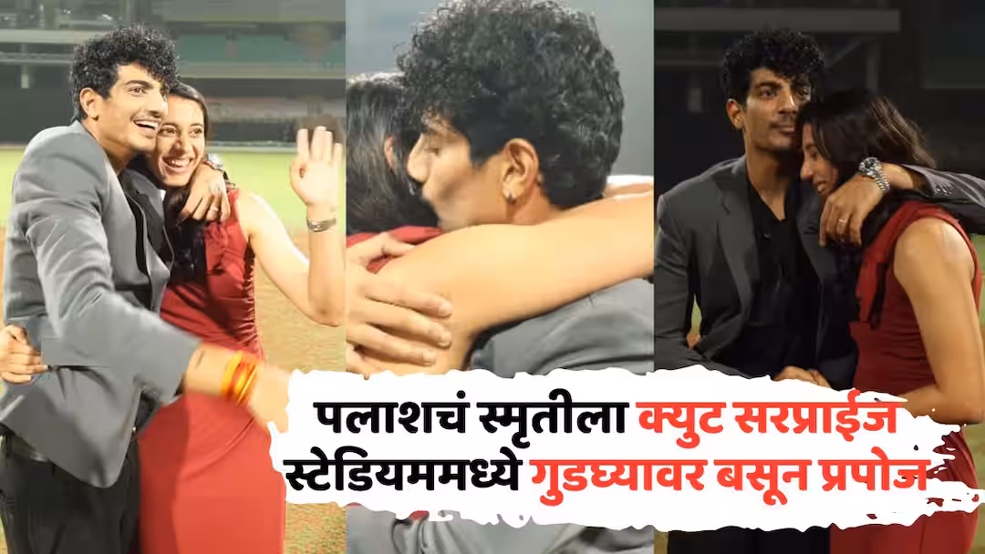 पलाश मुच्छलनं त्याच्या ऑफिशियल अकाउंटवरुन एक व्हिडीओ शेअर केलाय. व्हिडीओच्या सुरुवातीलाच पलाश आणि स्मृती डीव्हाय पाटील स्टेडियममध्ये एन्ट्री करताना दिसतायत. पण, स्मृतीचे डोळे झाकलेले आहेत आणि पलाश तिला हात पकडून स्टेडियममध्ये घेऊन येतोय. पण, जसं स्मृती तिच्या डोळ्यावरची पट्टी काढते, तसा तिला आश्चर्याचा धक्का बसतो. तेवढ्यात पलाश गुडघ्यावर बसून तिला प्रपोज करत एक लाल गुलाबांच्या फुलांचा गुच्छ देतो आणि गुडघ्यावर बसून तो तिला अंगठी घालून प्रपोज करतो. त्याच क्षणी स्मृती खूपच इमोशनल होते. तसा पलाशही काहीसा भावूक होतो आणि स्मृतीला मिठी मारतो.