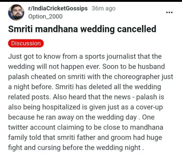 क्रिकेटपटू स्मृती मानधना आणि संगीतकार पलाश मुच्छाल यांच्या हाय-प्रोफाइल व्यस्ततेबद्दल अफवा आणि अटकळांच्या झुंजीने ग्रासले आहे, परंतु कशाचीही पुष्टी झालेली नाही. 23 नोव्हेंबर 2025 रोजी नियोजित असलेले लग्न स्मृती यांच्या वडिलांना प्रकृती चिंताग्रस्त झाल्यामुळे पुढे ढकलण्यात आले, ज्यामुळे दोन्ही कुटुंबांना उत्सव स्थगित ठेवण्यास भाग पाडले. त्यानंतर, स्मृतीने तिच्या सोशल मीडिया खात्यांवरून लग्नापूर्वीचे सर्व फोटो काढून टाकले आणि समारंभांशी संबंधित सामग्री हटवली, ज्यामुळे लोकांची उत्सुकता वाढली.
