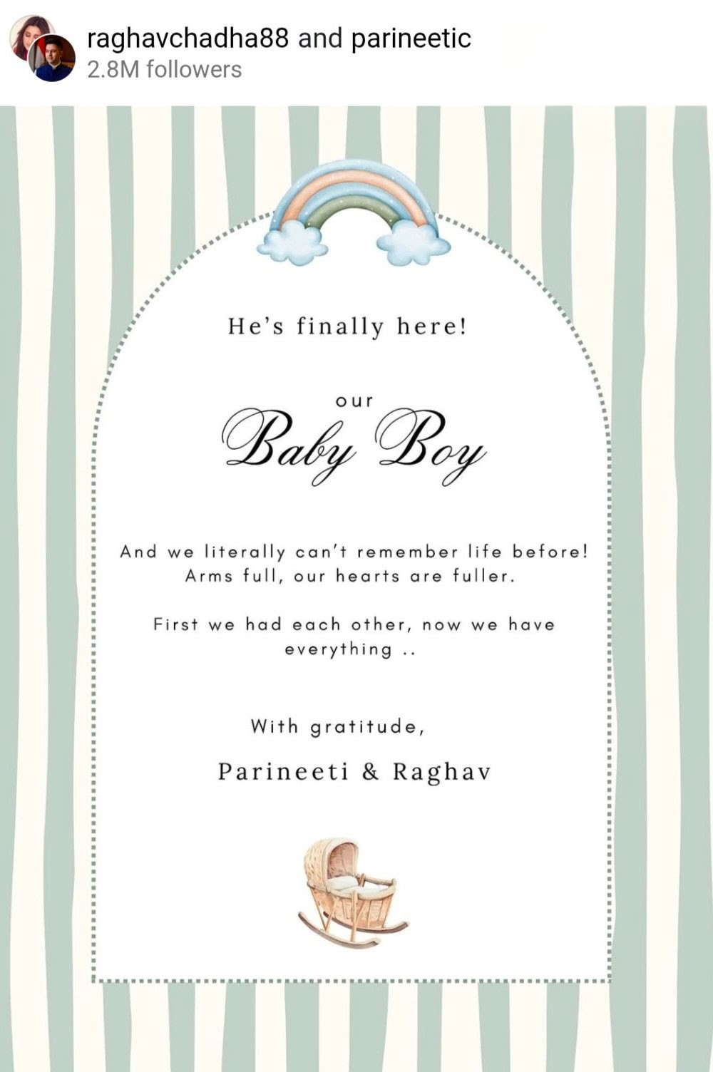 “शेवटी, तो आला आहे, आमचा मुलगा! या क्षणापूर्वीचे जीवन कसे होते ते आम्हाला आठवत नाही. आमचे हात भरले आहेत आणि आमचे हृदय आणखी भरले आहे,” या जोडप्याने त्यांच्या अधिकृत हँडलवर एका भावनिक पोस्टमध्ये लिहिले. “एकेकाळी फक्त आम्ही दोघेच होतो, आणि आता आमच्याकडे सर्व काही आहे,” असा संदेश त्यांचा आनंद आणि कृतज्ञता व्यक्त करत राहिला.