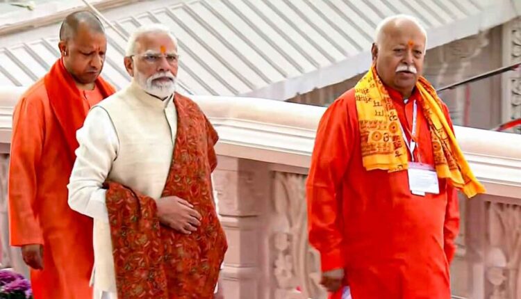 पंतप्रधान नरेंद्र मोदी आणि आरएसएसचे प्रमुख मोहन भागवत यांनी अयोध्येतील रामजन्मभूमी मंदिरावर खास तयार केलेला भगवा ध्वज फडकावला, मंदिराचे बांधकाम पूर्ण झाल्याची खूणगाठ. अध्यात्मिक प्रतीकांनी समृद्ध समारंभ, गर्भगृह, सप्तमंदिर आणि इतर पवित्र स्थळांवर प्रार्थना करण्यात आला.