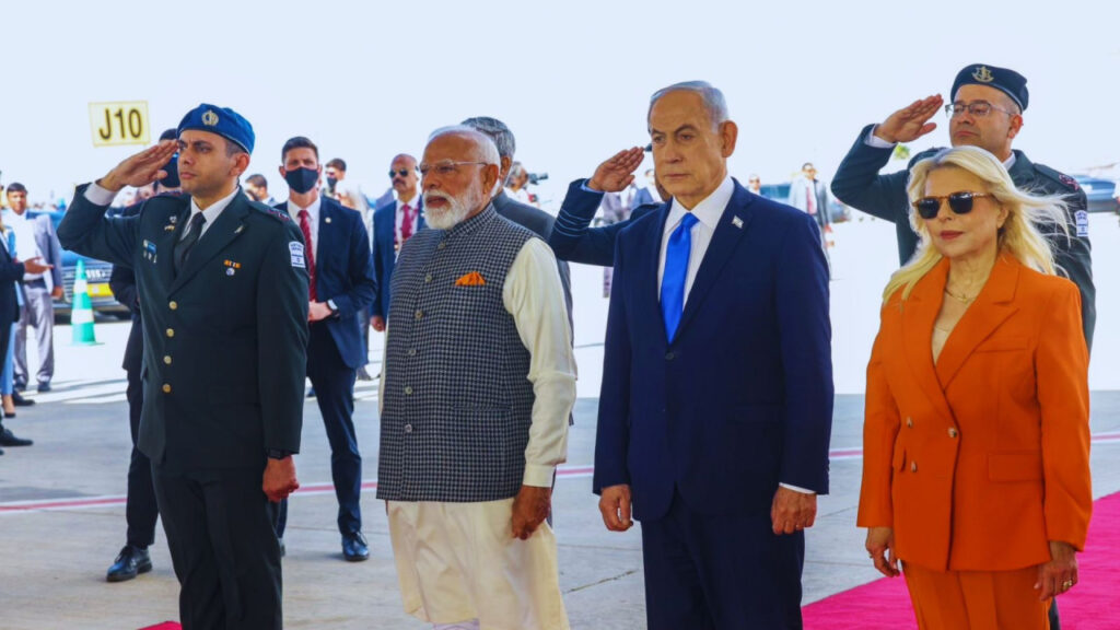 पंतप्रधान मोदी तेल अवीवमधील बेन गुरियन विमानतळावर उतरताच त्यांचे भव्य आणि सन्मानपूर्वक स्वागत करण्यात आले. इस्रायलचे पंतप्रधान बेंजामिन नेतन्याहू आणि त्यांची पत्नी सारा स्वतः तेथे पोहोचले आणि त्यांनी मोदींचे भव्य स्वागत केले. आपली गाढ मैत्री दाखवत नेतान्याहू यांनी सर्व प्रोटोकॉल तोडले आणि भारतीय पंतप्रधानांना विमानतळावरच गार्ड ऑफ ऑनर देण्यात आला. हे दृश्य दोन्ही नेत्यांमधील खोल वैयक्तिक रसायन आणि जागतिक मंचावर दोन्ही देशांमधील अतूट नाते यांचे जोरदार प्रदर्शन होते.
