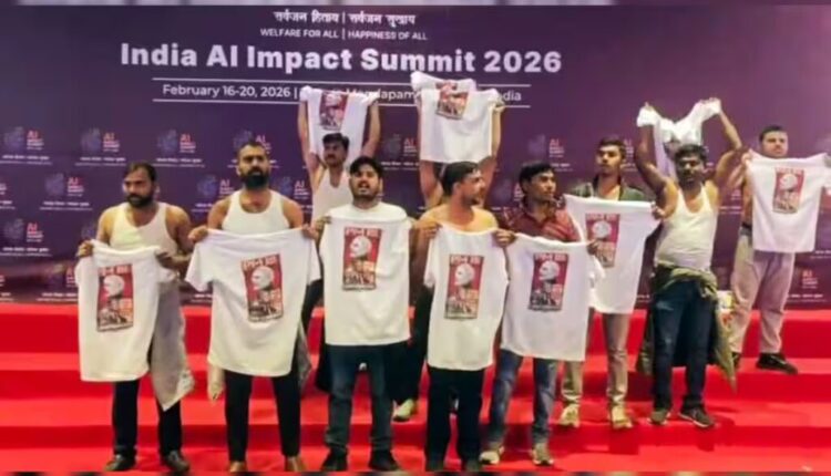 20 फेब्रुवारी रोजी, भारतीय युवक काँग्रेसच्या कार्यकर्त्यांनी एआय इम्पॅक्ट समिट 2026 मध्ये 'शर्टलेस' निषेध स्टंट केला.