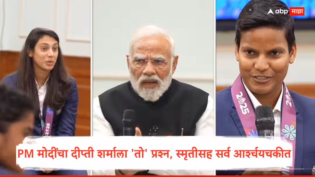 भारतीय संघ पंतप्रधान नरेंद्र मोदींना भेटणार बातम्या : भारतीय महिला क्रिकेट संघाने आयसीसी महिला वनडे विश्वचषक 2025 ची ट्रॉफी (India beat South Africa first World Cup title) जिंकल्यानंतर 5 नोव्हेंबर रोजी पंतप्रधान नरेंद्र मोदी यांची त्यांच्या निवासस्थानी भेट घेतली. या भेटीदरम्यान पंतप्रधान मोदींनी (पंतप्रधान नरेंद्र मोदी) सर्व खेळाडूंना त्यांच्या उत्तम कामगिरीबद्दल शुभेच्छा दिल्या तसेच त्यांच्या अनुभवांविषयीही गप्पा मारल्या. आता या संपूर्ण भेटीचा व्हिडिओ आता व्हायरल झाला आहे. या संवादादरम्यान पीएम मोदींनी महिला खेळाडूंना अनेक मजेशीर प्रश्न विचारले. ऑलराउंडर दीप्ती शर्माला तर असा एक प्रश्न विचारला की, तो ऐकून संपूर्ण टीम इंडिया थोडी आर्श्चयचकीत झाली. मोदींच्या शेजारी बसलेली स्मृती मानधना तर क्षणभर स्तब्धच राहिली.
