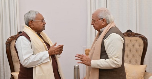 पाटणा. बिहारमध्ये सुरू असलेल्या राजकीय गोंधळाच्या पार्श्वभूमीवर मुख्यमंत्री नितीश कुमार यांनी अचानक राजभवनात पोहोचून राज्यपाल आरिफ मोहम्मद खान यांची भेट घेतली. सुमारे 13 मिनिटे चाललेली ही बैठक औपचारिक विदाई प्रोटोकॉल अंतर्गत झाली. बैठकीदरम्यान, राज्यपालांनी मुख्यमंत्री नितीश कुमार यांचे राज्यसभेतून नवीन डाव सुरू केल्याबद्दल त्यांचे अभिनंदन केले, तर मुख्यमंत्र्यांनी त्यांना भविष्यासाठी शुभेच्छा दिल्या.