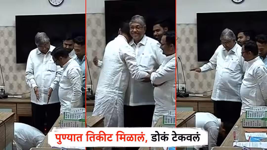 तिकीटाचा अत्यानंद; गुडघ्यावर बसले, डोकं टेकवलं, पुण्यात उमेदवाराने घेतले चंद्रकांत पाटीलांचे आशीर्वाद