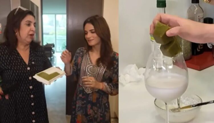 त्यानंतर राधिका मदन एका वाइन ग्लासमध्ये दोन चौकोनी तुकडे ओतते चास (ताक), जोडून, ​​”ते सेट होऊ द्या आणि त्याचा रंग किंचित हिरवा होईल. (ते सेट होऊ द्या. ते थोडे हिरवे होईल.)