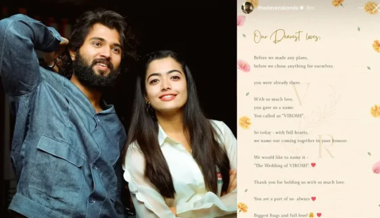 विजय आणि रश्मिका यांनी एक नोट शेअर केली होती: “आमच्या प्रिय प्रियजनांनो, आम्ही कोणतीही योजना करण्यापूर्वी, आम्ही आमच्यासाठी काहीही निवडण्यापूर्वी—तुम्ही आधीच तिथे होता. खूप प्रेमाने, तुम्ही आम्हाला एक नाव दिले. तुम्ही आम्हाला 'विरोष' म्हणून संबोधले. म्हणून आज — अगदी मनापासून, आम्ही तुमच्या सन्मानार्थ आमच्या एकत्र येण्याचे नाव ठेवतो. आम्ही त्याचे नाव ठेवू इच्छितो — 'VIRO Wedding' आमच्यावर खूप प्रेम आहे. आमचा भाग – नेहमीच सर्वात मोठी मिठी आणि पूर्ण प्रेम (sic)!”