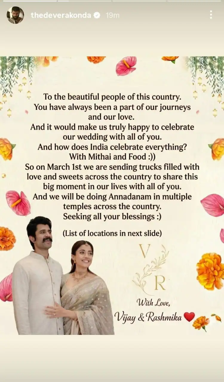 “या देशातील सुंदर लोकांसाठी. तुम्ही नेहमीच आमच्या प्रवासाचा आणि आमच्या प्रेमाचा एक भाग आहात. आणि तुमच्या सर्वांसोबत आमचे लग्न साजरे करताना आम्हाला खरोखर आनंद होईल. आणि भारत सर्व काही कसे साजरे करतो? मिठाई आणि खाद्यपदार्थांसह. म्हणून 1 मार्च रोजी आम्ही तुमच्या सर्वांसोबत आमच्या आयुष्यातील हा मोठा क्षण शेअर करण्यासाठी देशभरात प्रेम आणि मिठाईने भरलेले ट्रक पाठवत आहोत. विजय आणि रश्मिका.”