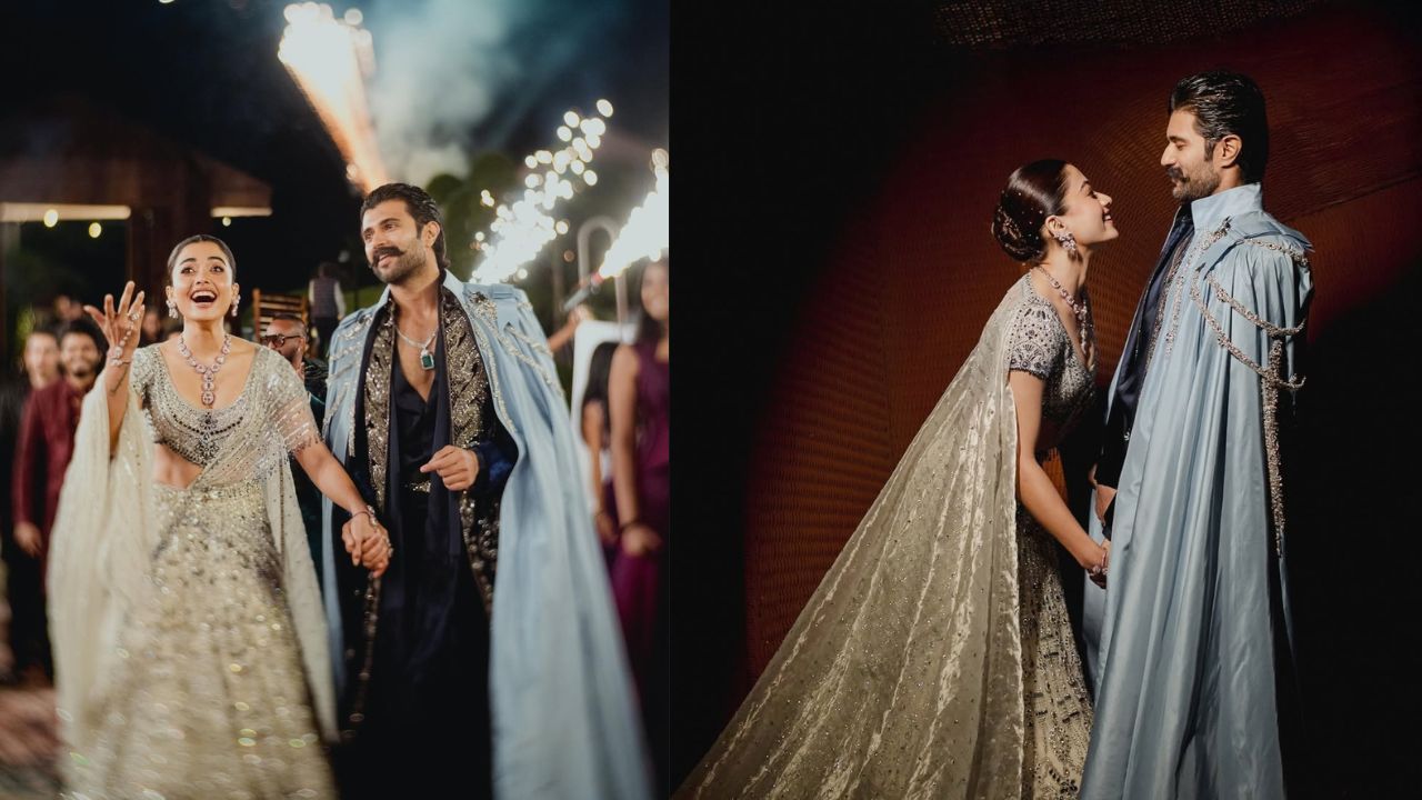 वधू रश्मिकाने सिक्विन शरारामध्ये शो चोरला, शर्टसह रॉयल-ब्लू शेरवानीमध्ये विजयचा दबदबा, संगीतासाठी या जोडप्याचा हा लूक होता.