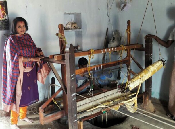 लेखिका, स्वप्नसुंदरी, कालेश्वरमजवळील महादेवपूरमध्ये हातमागाच्या बाजूला विणकामाची प्रक्रिया पाहत आहेत.