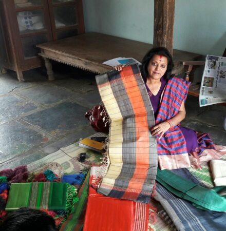 महादेवपूरमध्ये विणलेली तुसार सिल्क साडी असलेले लेखक.