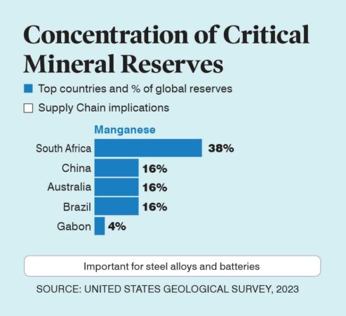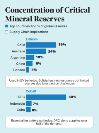 लिथियम ऑस्ट्रेलिया आणि चिली येथून, कोबाल्ट DRC मधून चीनद्वारे आणि ग्रेफाइट मोझांबिकमधून येते. हे अवलंबित्व आर्थिक आणि धोरणात्मक दोन्ही आहे. महागाई कमी कायदा (IRA), संरक्षण उत्पादन कायदा (DPA), आणि खनिज सुरक्षा भागीदारी (MSP) अंतर्गत महत्त्वपूर्ण खनिज पुरवठा साखळी सुरक्षित आणि वैविध्यपूर्ण करण्यासाठी यूएसने आपला प्रयत्न वेगवान केला आहे.