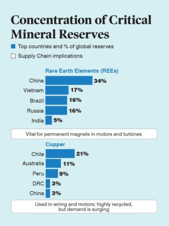 कमी-कार्बन तंत्रज्ञानावर ऊर्जा संक्रमण, जसे की इलेक्ट्रिक वाहने, पवन टर्बाइन आणि सौर पॅनेल, यावर खूप अवलंबून असतात गंभीर खनिजे बॅटरी, मॅग्नेट, वायरिंग आणि इतर घटकांसाठी आवश्यक. तथापि, पुरवठा भौगोलिकदृष्ट्या अत्यंत केंद्रित राहतो, ज्यामुळे जागतिक पुरवठा साखळींसाठी जोखीम निर्माण होते. 2023 यूएसजीएस डेटाच्या आधारे, राखीव असमानपणे वितरित केले जातात, ज्यामध्ये काही देश महत्त्वपूर्ण आहेत.